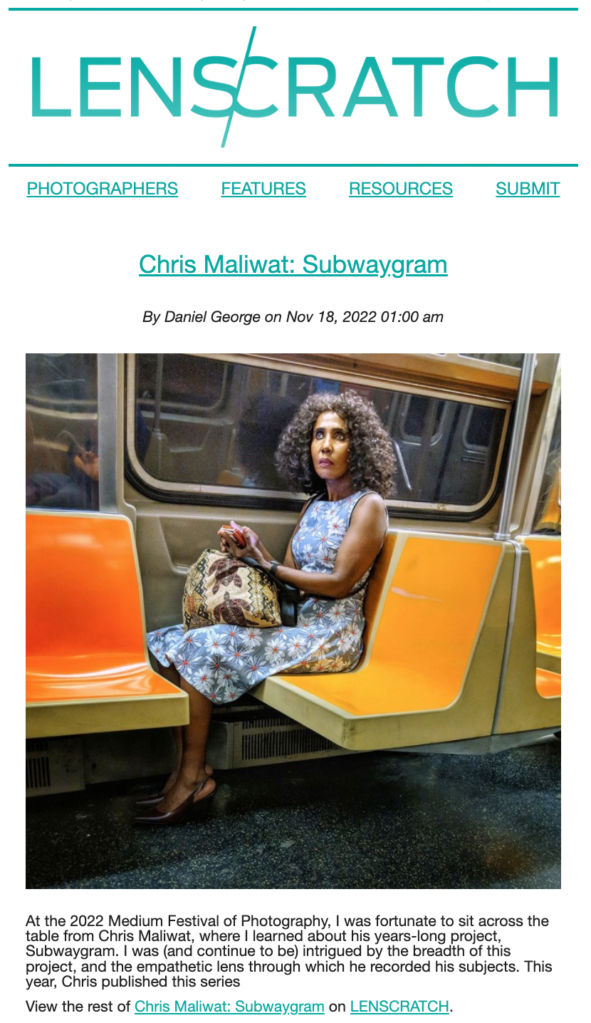 Chris Maliwat is a street-portrait photographer who captures surreptitious moments of everyday people on their journeys in the cities where they live. He has been photographing the subway for many years and sharing the images on his Subwaygram Instagram feed.